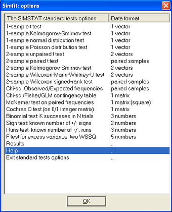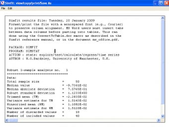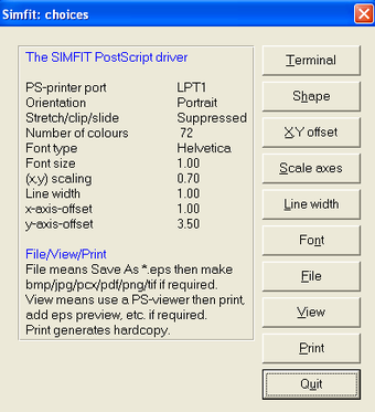 Una vez elegidos los parámetros pertinentes y ejecutadas las pruebas, los resultados o los gráficos producidos por Simfit pueden exportarse cortando y pegando el texto del visor o, en el caso de gráficos, guardarse mediante Ghostscript, que debe ser instalado aparte. Los gráficos pueden modificarse por completo en el aspecto.